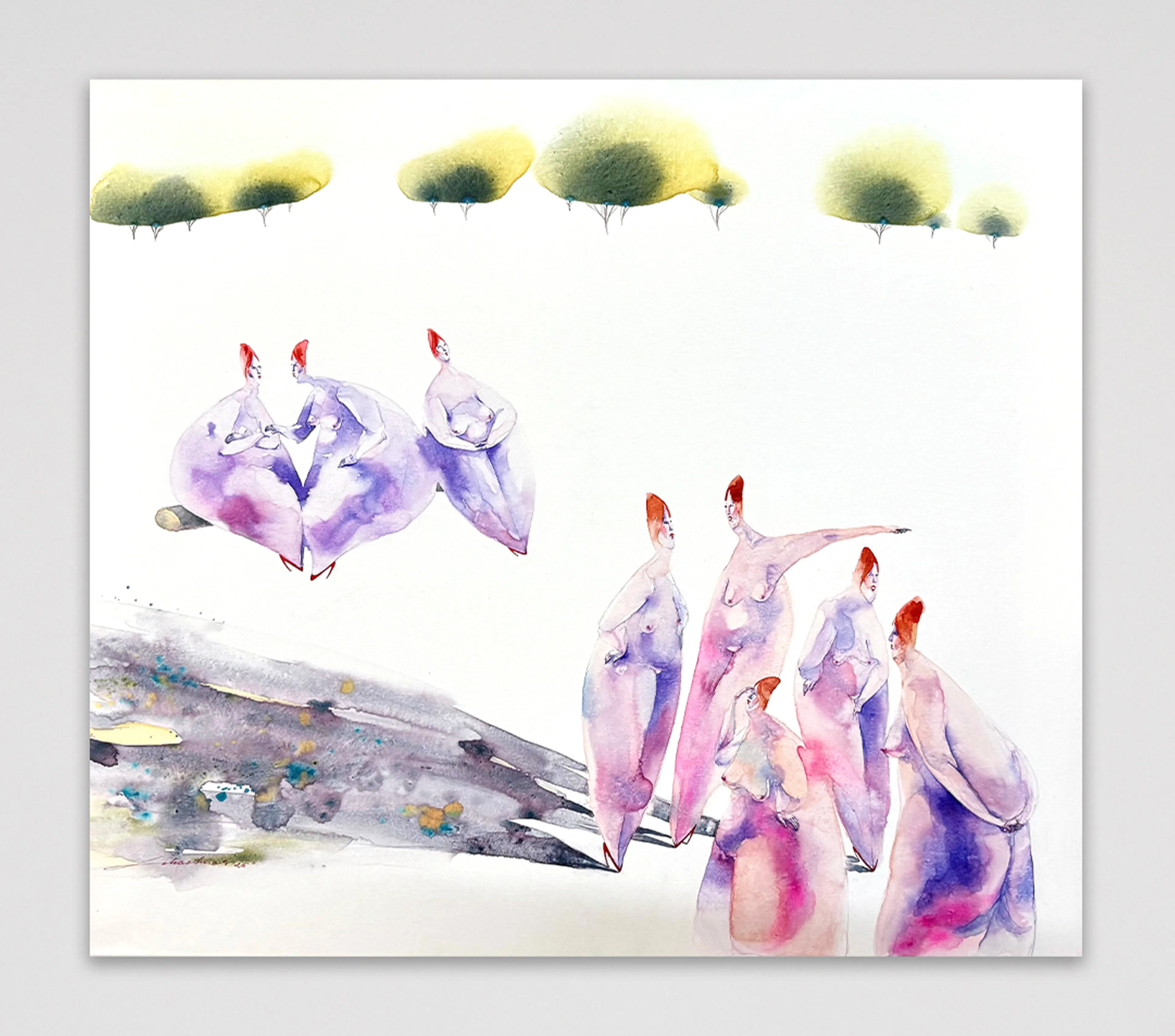 SHAHNAZ AGHAYEVA: Sadly, I rarely see women support women in society. It is a deeply upsetting subject for me. This series is about women who cannot coexist in a collective. For instance, in Internal Disagreements (2025), one group wants to move forward, while the other stops them: “Maybe we shouldn’t, maybe they’re lying.” Instead of uniting their strength to make the world better, women pull each other in different directions.